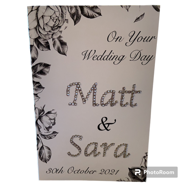 Personalised wedding card with the couples name and date of wedding.